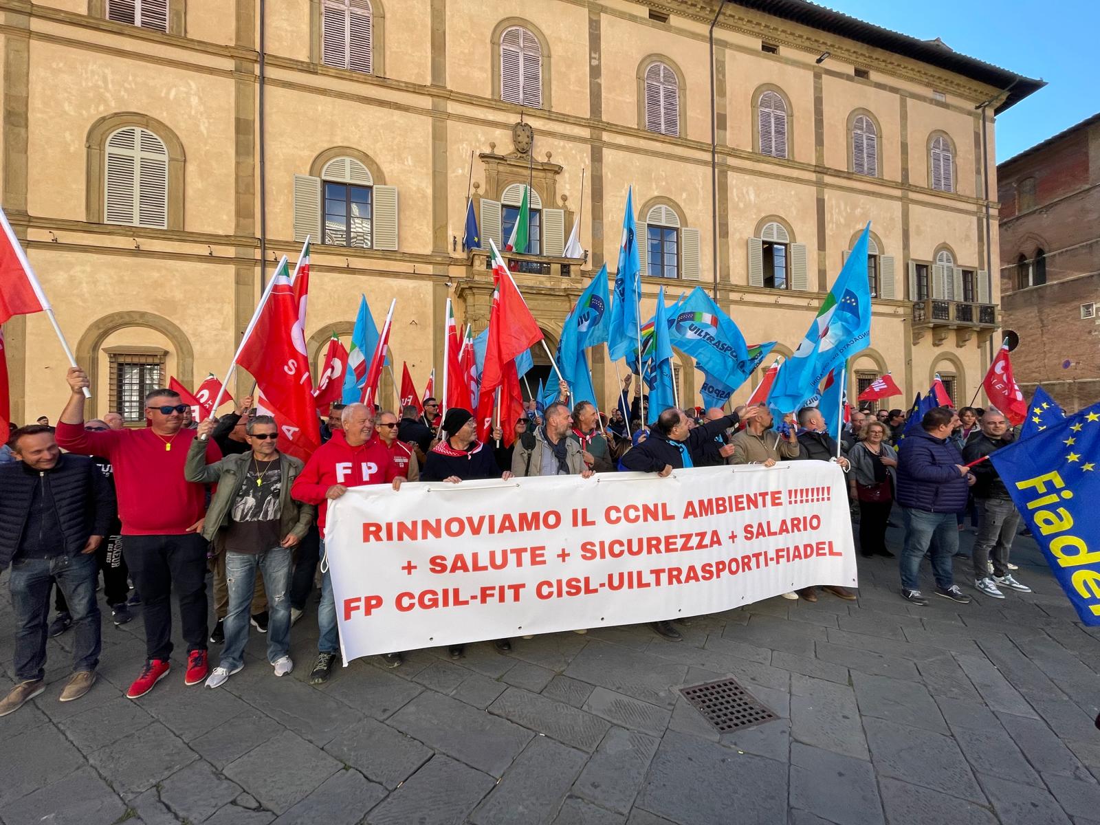 “Tasche vuote, cassonetti pieni”: presidio dei lavoratori dell’igiene ambientale, in 200 davanti alla Prefettura