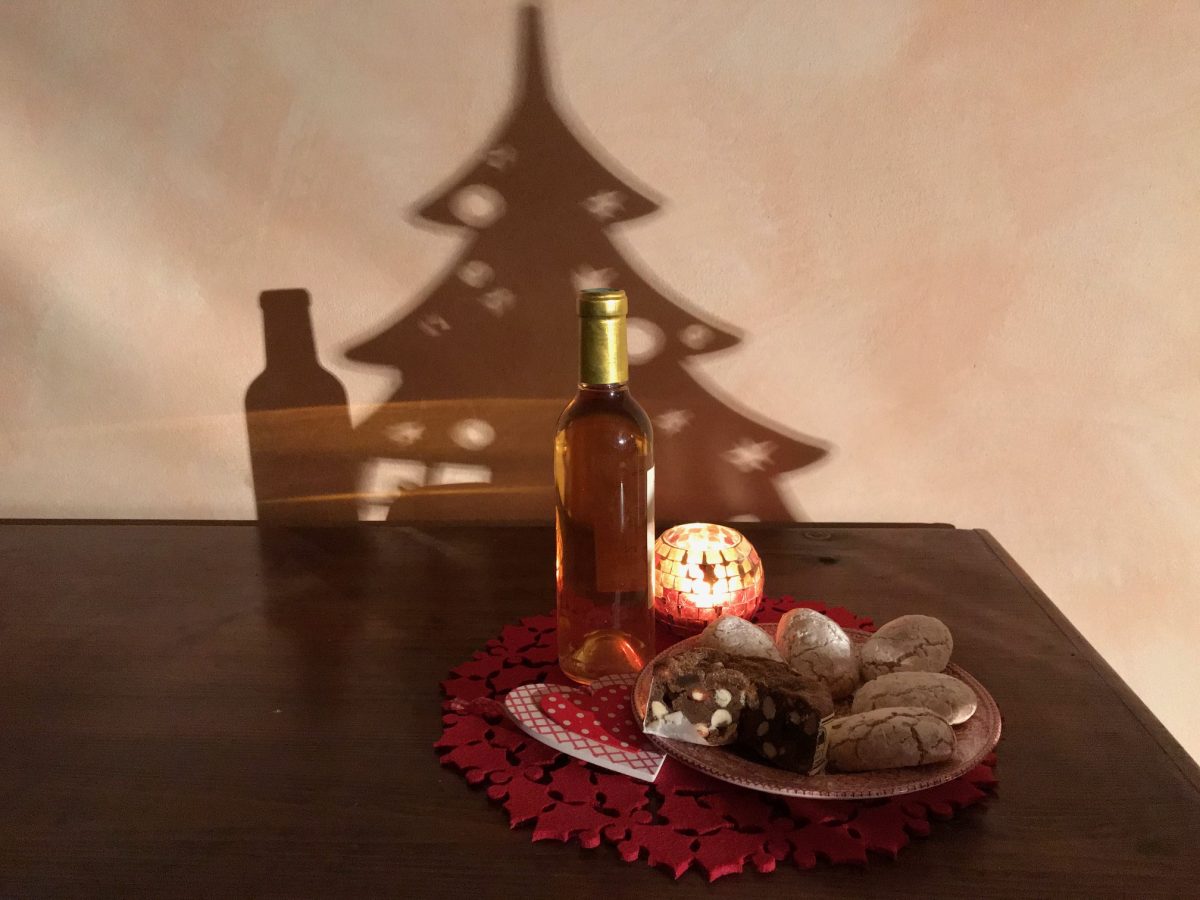 Per finire sulla tavola troveremo panforte, panpepato, copate e ricciarelli che d’obbligo vanno accostati ad un buon vin santo. Questo vino, che in passato quasi ogni contadino produceva nei propri caratelli nascosti nel sottotetto, per le feste veniva regalato alle persone importanti come ad esempio al dottore, proprio perché ritenuto pregiato. Oggi il vin santo ha perso un po’ della propria considerazione ed è stato soppiantato dal classico cesto contente varie prelibatezze. Ambrato, fruttato con sentore di miele e spezie, intenso, a volte secco altre volte amabile o abboccato, il vin santo si abbina ai dolci senesi non solo per abitudine, ma anche perché ne esalterà i sapori senza sovrastarli. Diffidate di chi vi offrirà una bollicina Brut con del panforte, qui proprio non ci va!