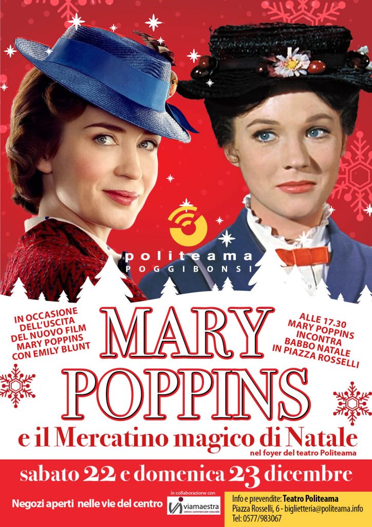Sarà un fine settimana all’insegna della magia quello al Teatro Politeama di Poggibonsi. In occasione dell’uscita del nuovo film “Il ritorno di Mary Poppins”, sabato 22 e domenica 23, a partire dalle 15.30, nel foyer saranno presenti il personaggio in costume di Mary Poppins, per allietare il pomeriggio di grandi e piccini, e un mercatino magico di Natale con gadget a tema. Alle 17.30, inoltre, in piazza Rosselli, Mary Poppins incontrerà Babbo Natale grazie alla collaborazione tra Fondazione Elsa e Associazione Via Maestra e Pro Loco Poggibonsi.